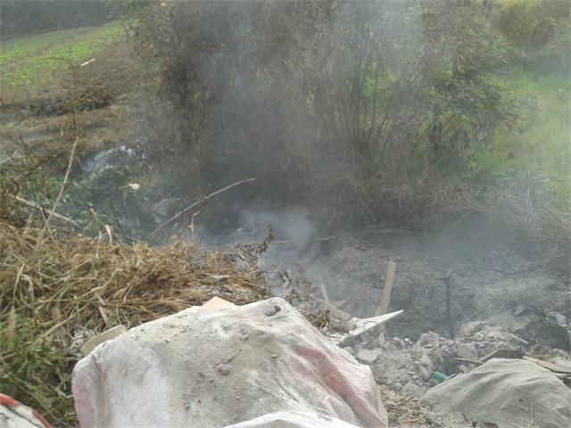 10月24日抗击雾霾第三天,我们巡查的笫一站是河东湖南城建职业学院对面的霞城乡霞城村一废墟围墙里,这是早上七点多钟当地一位村民打电话举报的,说这个废墟地里面变成了垃圾场,昨天就有人把这堆垃圾点燃了,烧到今天还没灭。我们赶到现场查看,看到烟雾成天,臭气难闻,马上拍照取证,并打电话向高新区环保局举报,半个来钟头,高新区城管大队派了一队人来现场,看到火势难以扑灭,就求助火警119,派消防车来现场扑灭的。这地方已经是第二次有人露天焚烧垃圾了。第二站巡查点是高新区农民街,这是一个由三个村组成的综合地,也是三不管的地方,有一个大露天垃圾池,前几天我经过此地,发现正在焚烧垃圾。这次特地过来巡查,虽然没烧垃圾,但里面发现一些工业电线橡胶,估计是马路边废品回收店倒的,所以我马上赶到废品店,向她们发放协会印制给废品回收店的倡议书,向她们宣传焚烧废工业垃圾是违法的,希望她们不要去焚烧。
