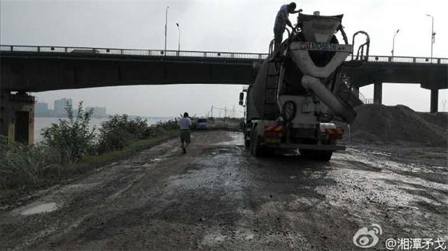 昨天湘潭环保协会矛戈接博友举报,说有水泥罐车在河堤上倾倒水泥浆余料。今天,矛戈和新加入的环保志愿者@湘潭老陈@小麻雀@快乐的人1号到现场查看,发现湘潭市二大桥下,确实有庞龙建材有限公司水泥罐车的水泥浆余料、洗罐废水冲刷进入湘江河道!