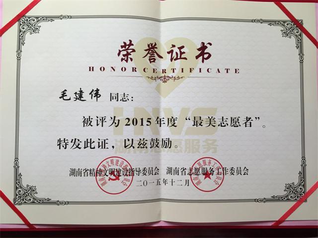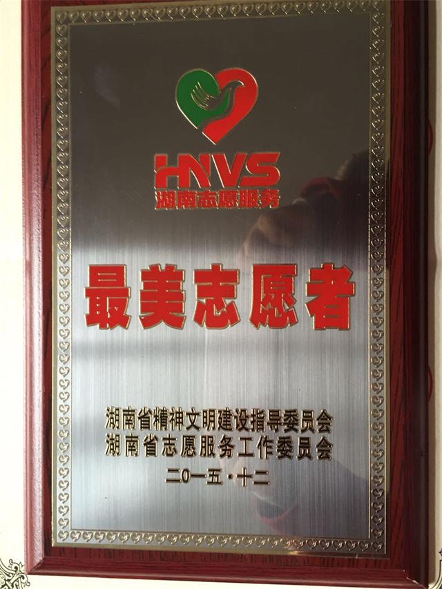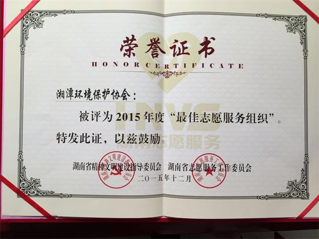 2015年12月2日,由湖南省文明委、省志工委主办的“向志愿者致敬”全省学雷锋志愿服务先进典型颁奖典礼,于长沙民政职业技术学院隆重举行。在此次颁奖典礼上,湘潭环保协会被评为“最佳志愿服务组织”,协会志愿者何旭东、刘芳被评为“绿色卫士之星”,协会志愿者毛建伟、胡劲松被评为“湖南省最美志愿者”。