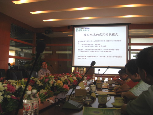 首先,我们在武汉市人大城环委,听取了格林美公司派驻武汉负责人、格林美副总张鹏同志关于在武汉市成功组织废旧电池回收和电子废弃物回收的经验介绍。格林美公司在湖北省9大城市都进行了这一活动。该活动深入工厂、社区、超市。得到了政府的政策支持,也得到了群众的拥护,取得了显著成绩。湖北日报、长江日报、人民日报作了大量报导。