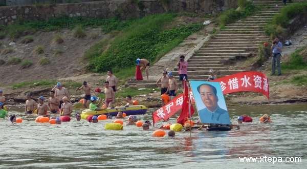 “同住湘江边,共饮湘江水,爱护母亲河,你我共行动!”7月16日,为纪念毛泽东主席畅游长江44周年,湘潭市70余名游泳爱好者自发畅游湘江,并以环保志愿者的身份向社会各界呼吁“爱护母亲河,还我碧水蓝天”。