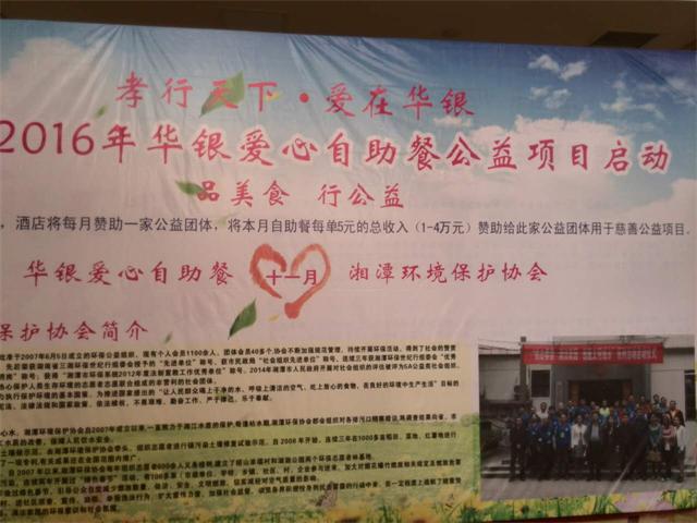 在这次2015年到2016年华银自助餐爱心公益项目启动活动中,湘潭环境保护协会作为受资助的公益团体,每天都会派四名志愿者,分别在中,晚餐时参与这项公益活动。