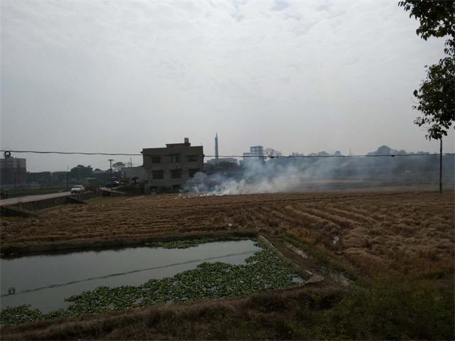 12时10左右宣传车巡查到原老韶氮附近,发现田中到处都在焚烧秸杆,只好拍照取证。接到河东霞城乡霞城村附近村民举报,有人在马路边焚烧树枝、杂草等垃圾,从上午9点来钟烧起到下午1点多钟了,火势很大,烟雾冲天。赶到后打环保举报12369电话一直打不通,最后直接打给岳塘区环保局刘勇局长。大约十多分钟后,他带了一班人过来,拍照取证。并用带来的灭火器扑火,因火势太大无法扑灭。我只好报119火警,来消防车才把火扑灭。