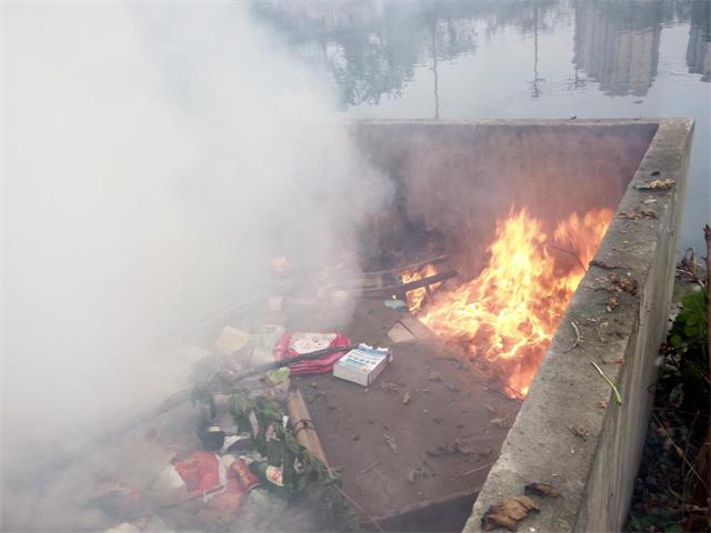 上午9时在先锋乡先锋村湘泰天阳家具工厂店旁边一废弃地发现一堆垃圾正在焚烧,拍照取证后,发现里面有很多废塑料等,臭气难闻。向旁边村民了解,不知是谁烧的,只好在旁边借个水桶,提着水把火扑灭。
