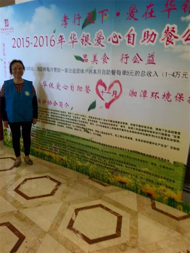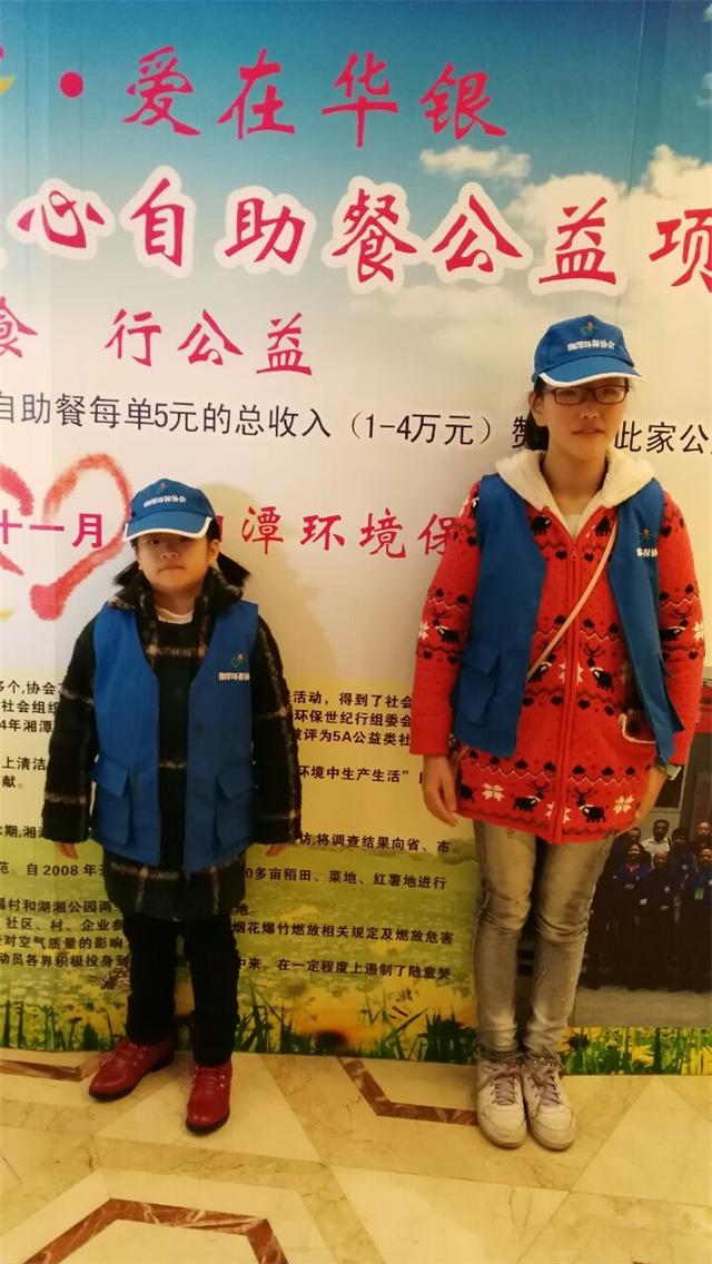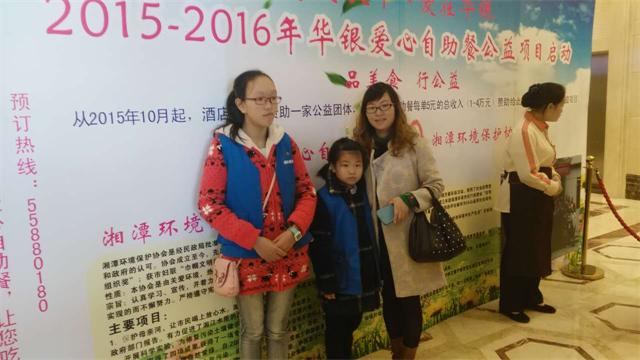 每一单,捐五元!品美食,行公益!从2015年10月起,华银大酒店每月赞助一家公益团体,每单自助餐捐出5元,捐赠给公益团体用于慈善公益项目。来华银吃自助餐,就是支持公益活动!今天是11月15日湘潭环保协会志愿者王旭红带着两个女儿中午在华银自助餐厅为