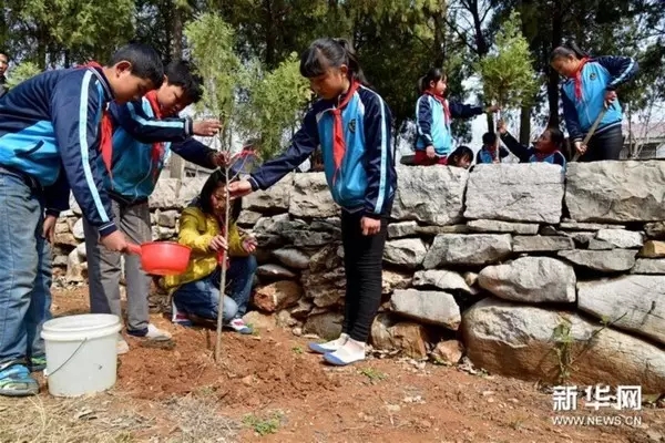 山东省枣庄市山亭区东河小学学生在烈士陵园栽种树