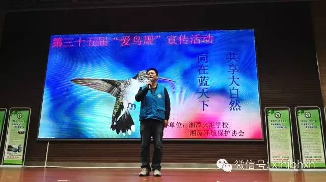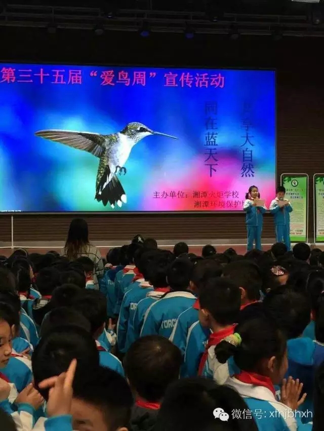 今天一早,岳塘区火炬学校精心打造了一次主题周会—“同在蓝天下,共享大自然”爱鸟周宣传活动,全校2500多师生齐聚体育馆参加活动,会场展示了精美的鸟类图片,两位同学向全校师生介绍爱鸟知识。湘潭环保协会副秘书长矛戈代表协会上台和同学们交流,希望同学们:1.不打鸟捕鸟,不掏鸟蛋、捅鸟窝;2.不破坏鸟类的栖息地,保护树木;3.给父母宣传爱鸟知识;4.发现有伤害鸟类的行为要告诉老师、大人;5.从爱鸟开始,做一个环保志愿者。同学们在爱鸟宣传板上签名,画上了美丽的小鸟!