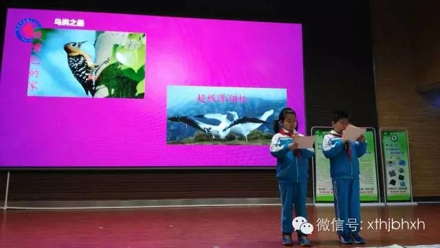 ,两位同学向全校师生介绍爱鸟知识。