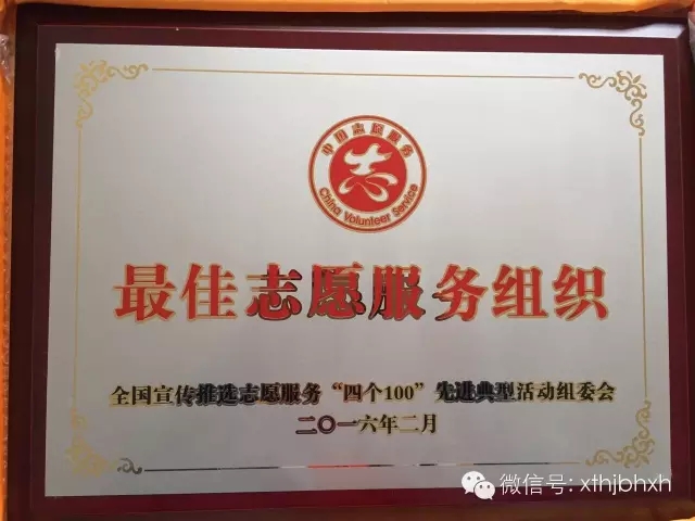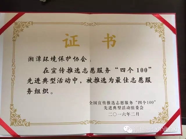 天上午在长沙召开“湖南省学雷锋志愿服务工作推进会”,会上省委宣传部部长、省文明办主任刘进能为湘潭环保协会秘书长李健如颁发全国“四个100”“最佳志愿服务组织”奖牌。湘潭环保协会理事长宋厚源闻讯激情难抑,提笔写下了“百佳为起点,再创新辉煌”两句话激励协会同仁。我们将以此为动力,砥砺前行,让环保理念深入人心,为实现湖湘大地的碧水蓝天做出更多更大的贡献!上,湖南省委宣传部副部长、省文明办主任、省志工办主任刘进能讲话,要求南继续扩大志愿服务的覆盖面,推动志愿服务的常态化,制度化和专业化。湖南各级文明办要联合各部门定期为志愿者开展专业培训,完善针对志愿者的基本保障制度,继续围绕传统节日开展十大志愿服务主题活动。湘潭环境保护协会是经民政局批准于2007年6月5日成立的环保公益组织,现有个人会员1100余人,团体会员57个,理事长是原湘潭市政协主席宋厚源,法人代表是秘书长、副理事李健如。协会不断加强规范管理,持续开展环保活动,成立九年来,湘潭环境保护协会在保护湘江、抗击灰霾、倡导全民绿色生活、协助环保部门查处环境污染违法行为的工作中,做出了重大贡献,受到湘潭市委、市政府的认可,得到环保职能部门的称誉,也得到社会各界的赞誉,被人民日报、新华社、CCTV-10频道、中国环境报、中国网等全国媒体均进行了报道,成为了湘潭一张闪亮的名片。 协会成立至今,先后荣获湖南省三湘环保世纪行组委会授予的“先进单位”称号、市民政局“社会组织先进单位”称号,连续三年获湘潭环保世纪行组委会“优秀组织奖”;获“湘潭市环保系统2012年度法制宣教工作优秀单位”称号;2014年,被评为湘潭市唯一的公益类5A级社会组织;2015年,获湖南省精神文明