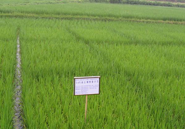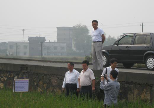 2008年10月9日省农科院土肥所副所长纪雄辉博士{左二}、中南大学化学化工学院叶华博士{右二}在协会副理事长王国祥的陪同下,到《重金属污染土壤修复及生物能源利用集成技术示范》项目的试验田查看。