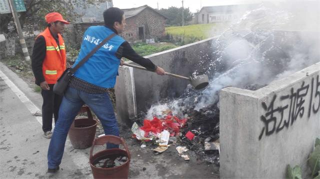 10月28日,湘潭环保协会抗霾巡查组在姜畲镇泉塘村马路边发现垃圾池有垃圾在烧,村里卫生员在提水灭火,据他说是流浪汉点的火,巡查队员沈政伟一起提水灭火,并发放“焚烧垃圾危害健康~致环卫工人的一封信”,大力宣传大气污染治理特护期环境保护。