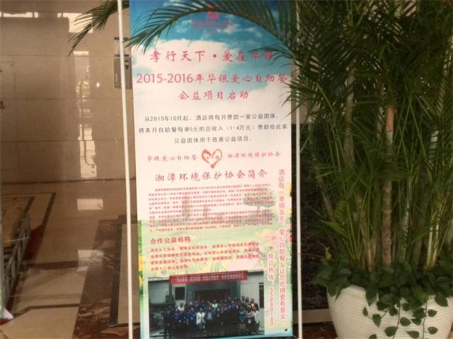 在这次2015年到2016年华银自助餐爱心公益项目启动活动中,湘潭环境保护协会作为受资助的公益团体,每天都会派四名志愿者,分别在中,晚餐时参与这项公益活动。